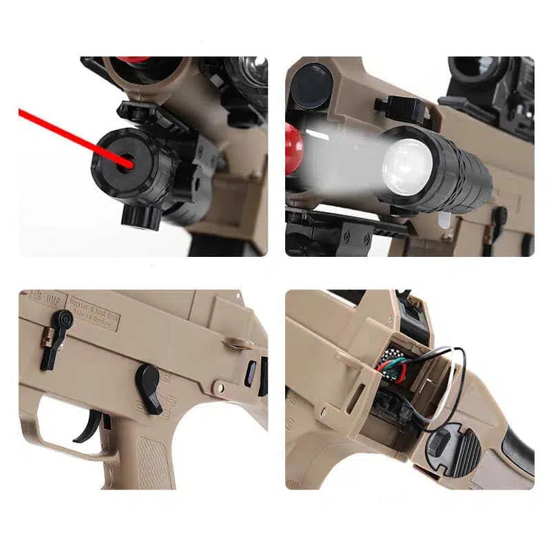 The UMP 45 Gel Ball Blaster in the colour tan has a variety of new features. This gel blaster is perfect for anyone just getting into the gel blaster sport. It has gen8 gearbox, a foldable stock, a scope, flashlight, laser and even has an alloy barrel.